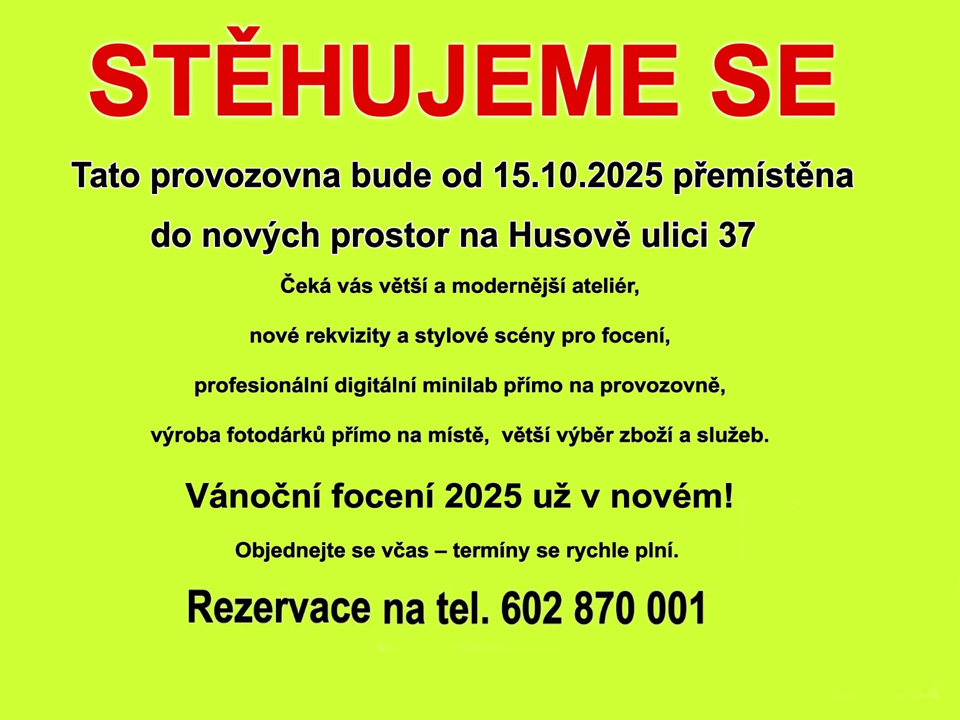 Profesionálně zpracováváme klasické(negativ) i digitální fotografie, fotoknihy, fotoobrazy, fotodárky (hrnečky, polštářky, puzzle, trička atd.), porcelánové fotografie na hroby, reprodukce fotografií papírových i negativů+DIA, přepisy starých videozáznamů (8mm film, vhsc, hi8, hi8i, VHS,mini DVD,..) Více informací naleznete ZDE